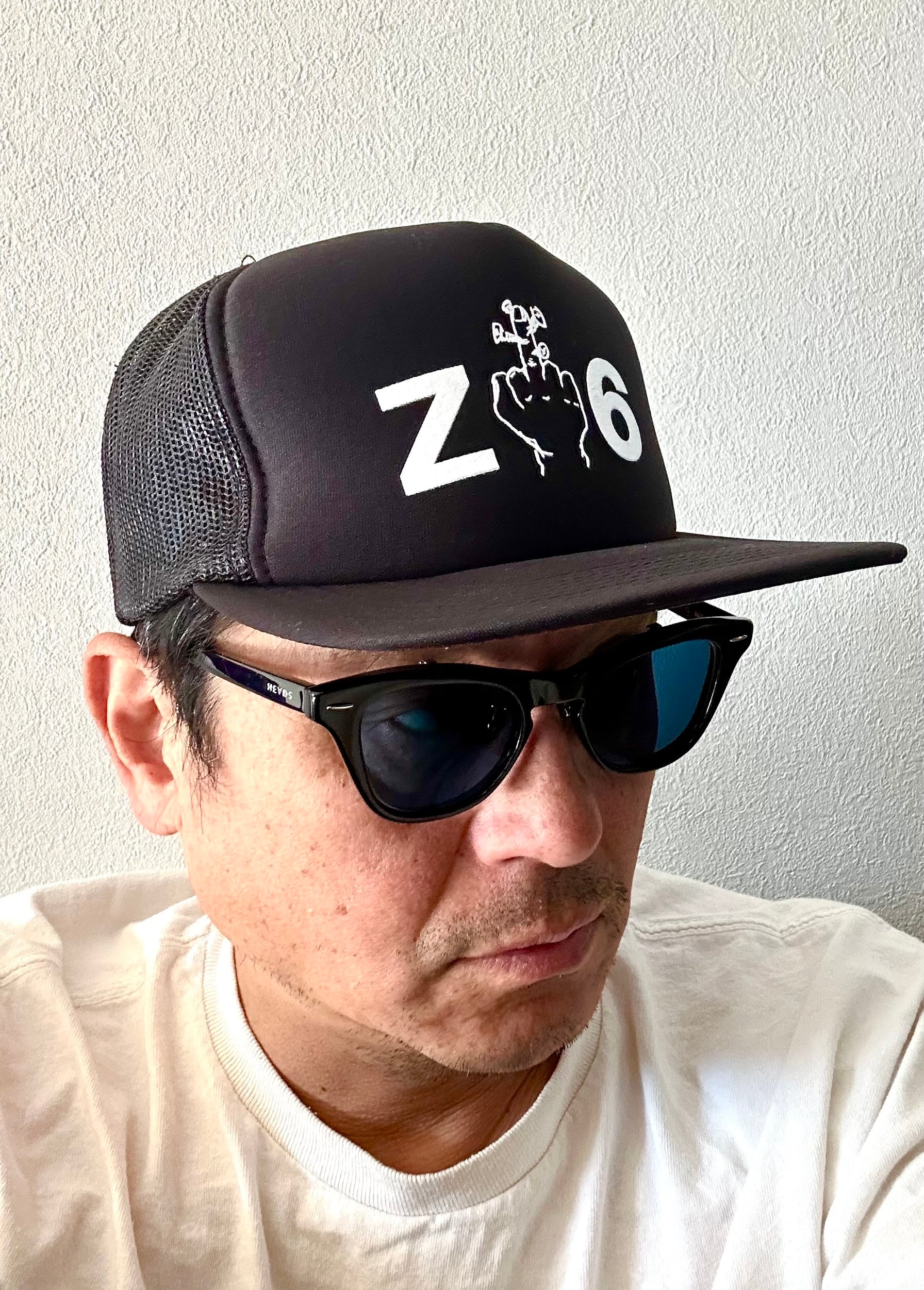 その中指を数字の"1"に見たてアレンジしました。20年前と変わらない今の世の中をこのメッシュキャップに落とし込みました。